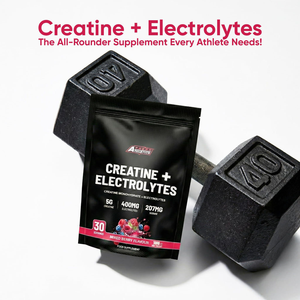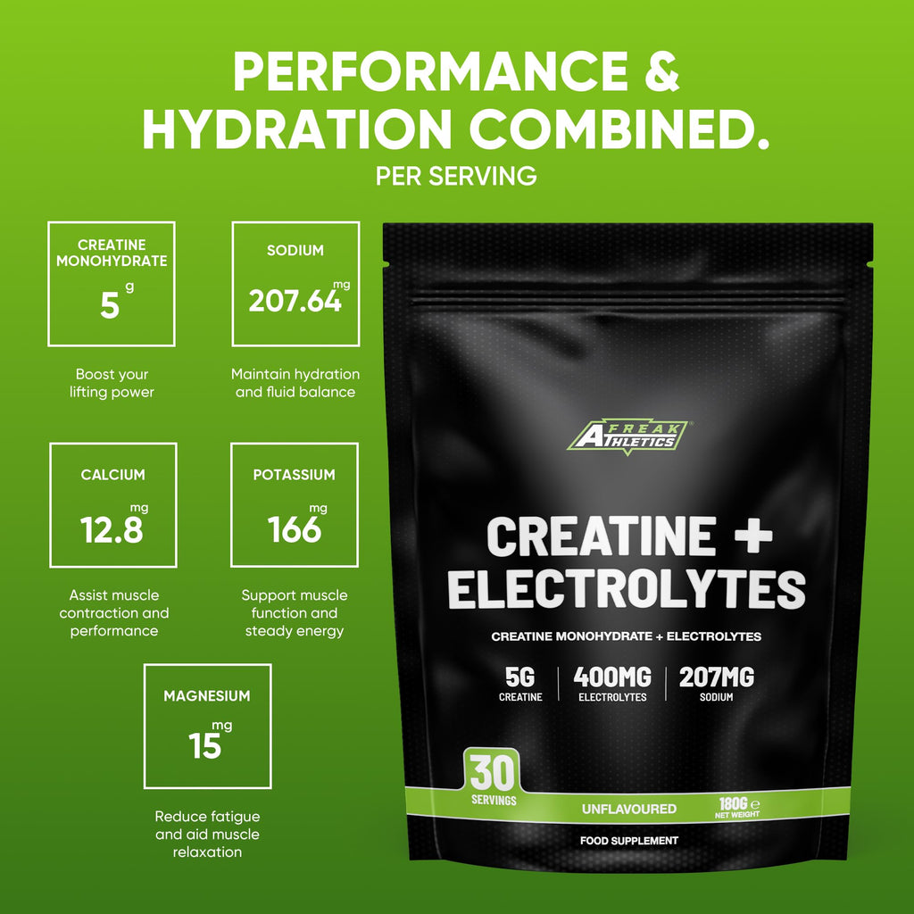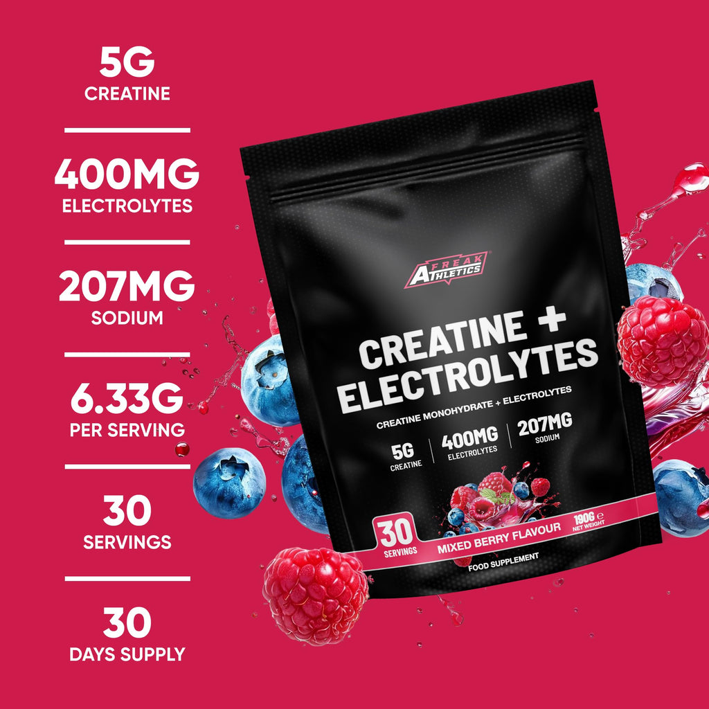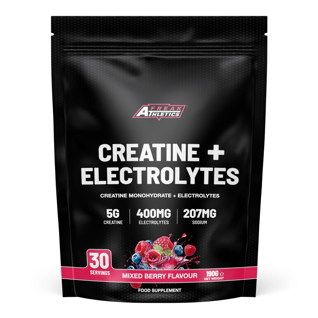 Unlock peak performance, hydration and training intensity with Freak Athletics Creatine Monohydrate & Electrolytes Powder, a powerful all-in-one formula designed for athletes who want more than standard creatine. Each serving provides 5g of pure creatine monohydrate paired with 400mg of essential electrolytes including sodium, potassium, magnesium and calcium - helping support strength, endurance, hydration and faster recovery. This creatine and electrolytes blend helps maintain fluid balance, enhances ATP energy production, improves muscle contraction and supports your body through high-intensity workouts. Whether you’re lifting weights, training for HYROX, running, cycling or doing intense cardio, this formula helps you perform harder and recover better. The Mixed Berry flavour offers a smooth, refreshing taste with zero sugar, making it ideal for pre-workout energy, intra-workout hydration or daily electrolyte replenishment. With 30 servings per 190g pouch, it delivers excellent value while helping you stay fuelled, balanced and ready for your next session. Perfect for anyone looking for creatine with electrolytes, hydration support, pre-workout creatine powder or electrolyte drink powder for clean, sustained performance.
