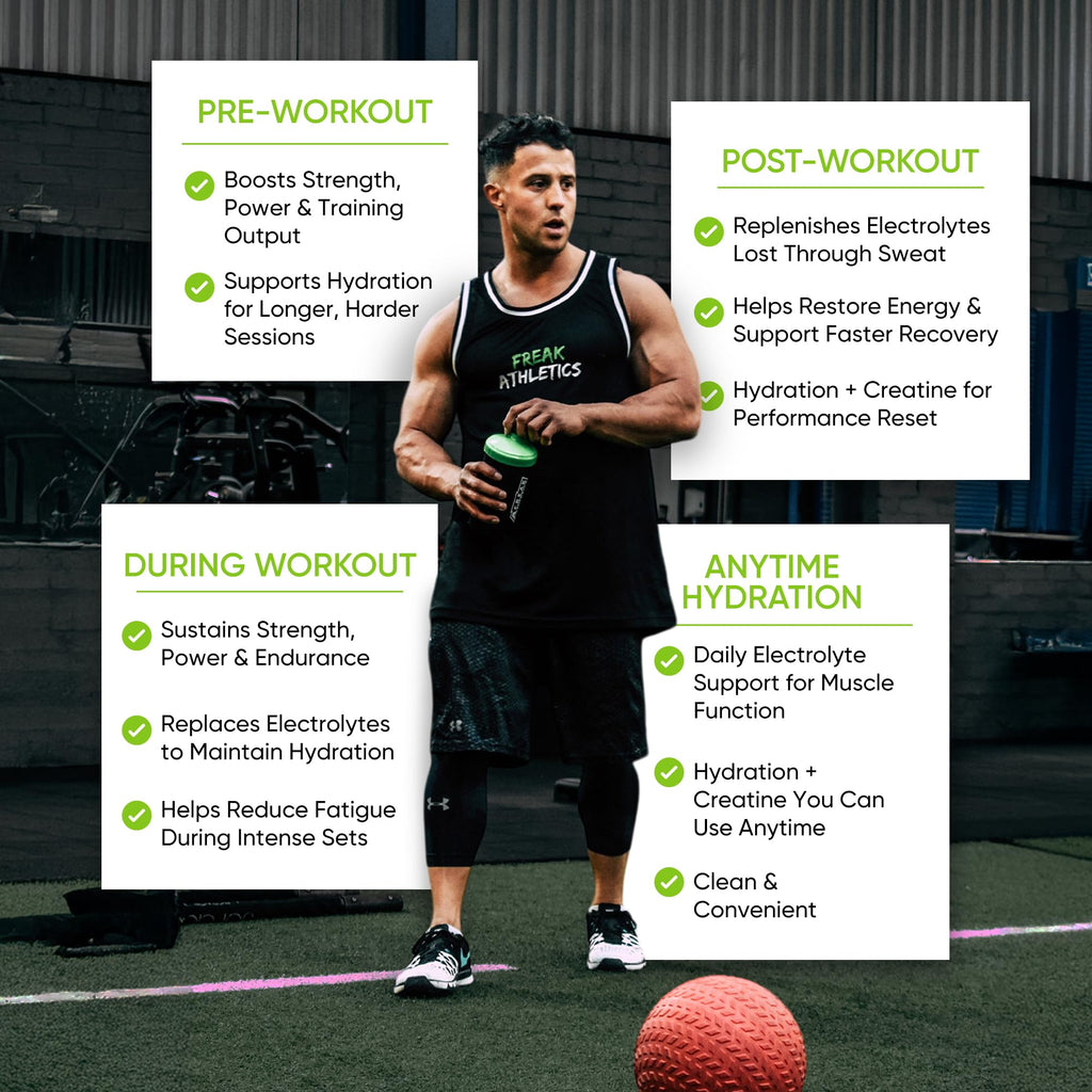 • π’π”πππŽπ‘π“π’ π‘π„π‚πŽπ•π„π‘π˜ 𝐁𝐄𝐓𝐖𝐄𝐄𝐍 𝐒𝐄𝐓𝐒 & 𝐇𝐄𝐋𝐏𝐒 π˜πŽπ” ππ„π‘π…πŽπ‘πŒ 𝐑𝐄𝐏 𝐀𝐅𝐓𝐄𝐑 𝐑𝐄𝐏 : Freak Athletics Creatine Monohydrate helps fuel repeated efforts during resistance training by supporting ATP regeneration, while electrolytes replace minerals lost through sweat to keep your performance consistent. Ideal for lifters, endurance athletes and anyone looking to improve training momentum. Pairs perfectly with your pre-workout, hydration routine or post-workout shake for daily performance and progression.